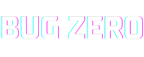 "Bug Zero" text in white with glitch effect on black background, synthwave vibes